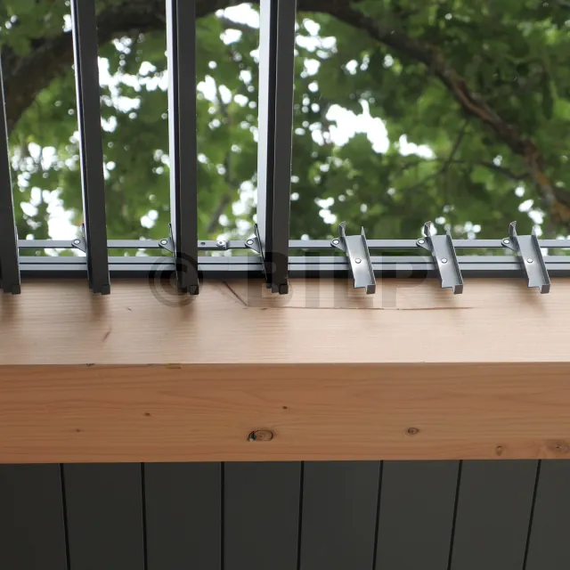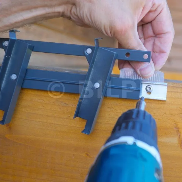 Unsichtbare Befestigung: Die Mechanismen werden durch ein spezielles Endstück zusammengefügt, das selbst am Träger (z. B. Pergolabalken) befestigt ist. Die Befestigung muss einen Durchmesser von 5 mm haben und aus Edelstahl bestehen. Seine Länge und Art hängen vom Träger ab: