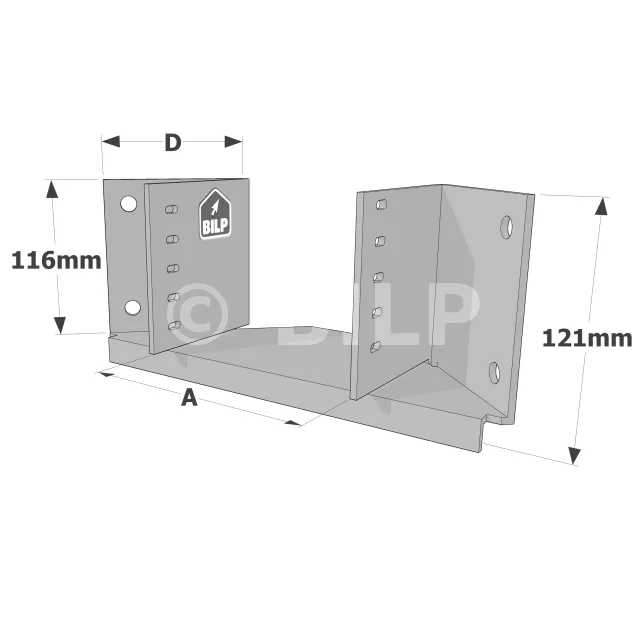 Dieser Balkenschuh ermöglicht die Aufnahme von Dachbindern in gemauerten Ecken mit einem Winkel von 90°. Er ist in der Breite wahlweise zwischen 76 und 150 mm faltbar und in der Breite 38 mm erhältlich.