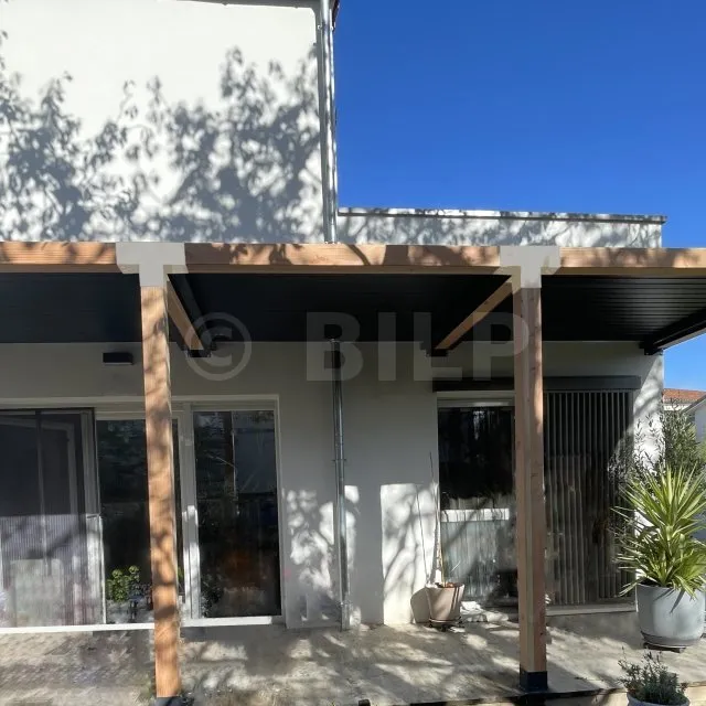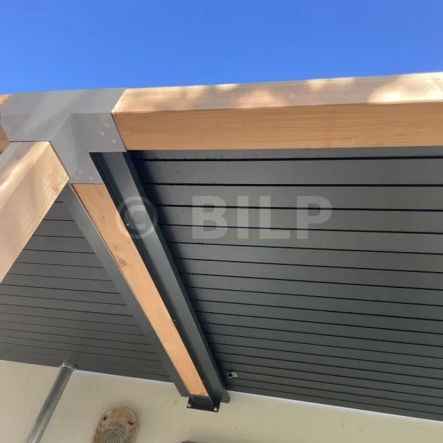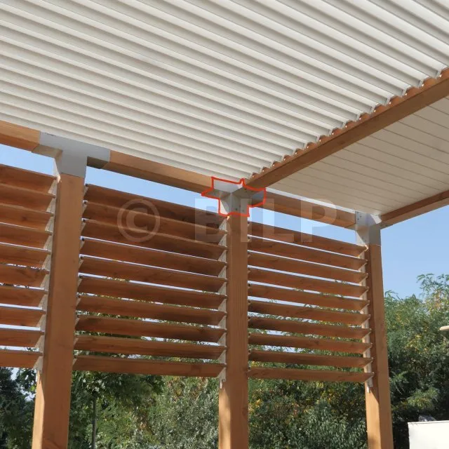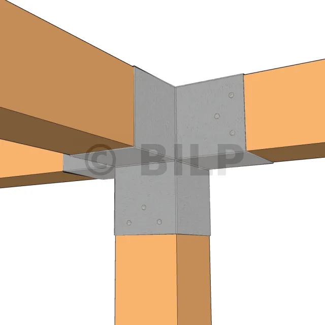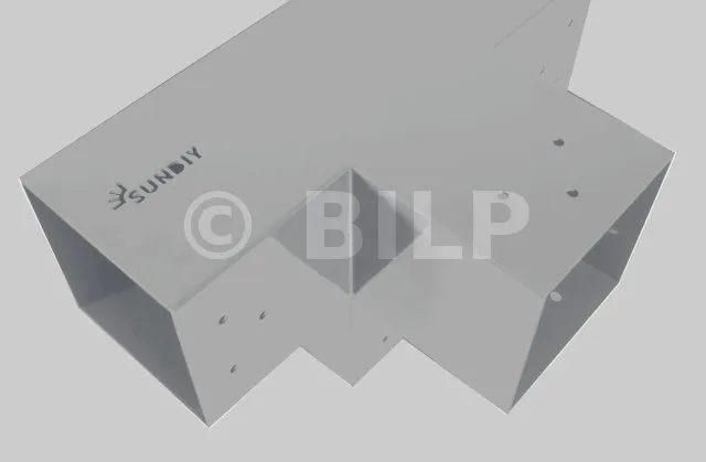 Damit kann eine 120x120mm-Stütze senkrecht zu einem 120x120mm-Chevron angebracht werden, die insgesamt von einem 120x120mm-Vertikaltopf unterstützt wird.