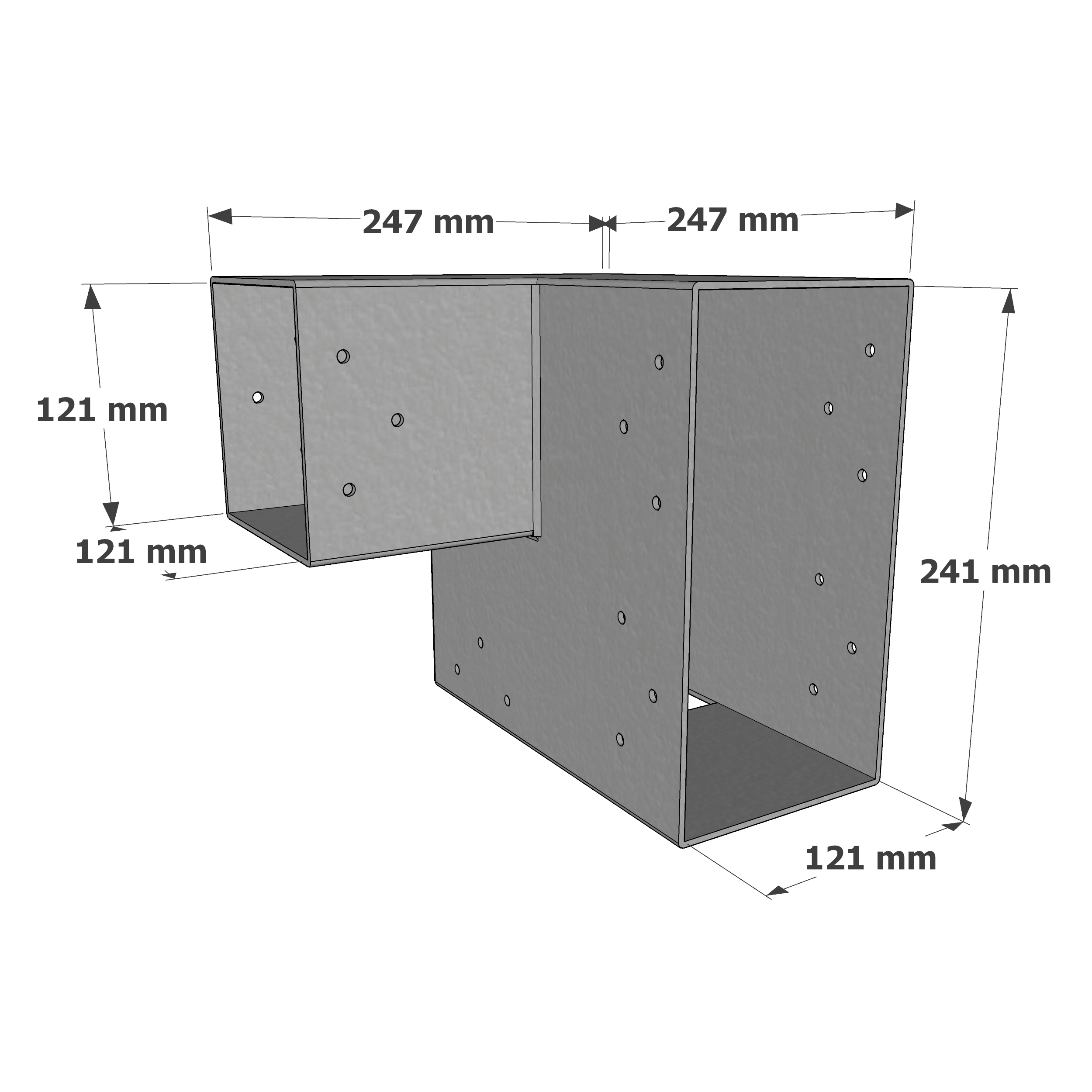 Es wird in einer Außenecke verwendet. Mit diesem Verbinder können Sie einen großen Balken von 240 x 120 mm senkrecht mit einem Balken von 120 x 120 mm verbinden, wobei das Ganze von einem vertikalen Pfosten von 120 x 120 mm getragen wird.