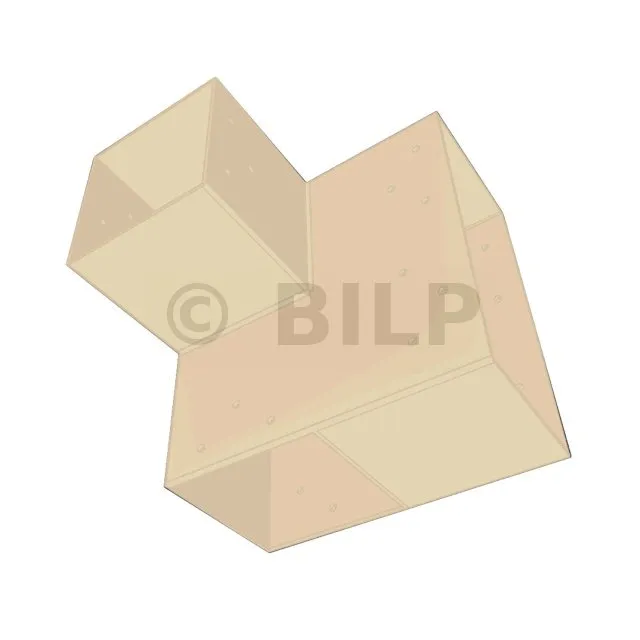 Es wird in einer Außenecke verwendet. Mit diesem Verbinder können Sie einen großen Balken von 240 x 120 mm senkrecht mit einem Balken von 120 x 120 mm verbinden, wobei das Ganze von einem vertikalen Pfosten von 120 x 120 mm getragen wird.