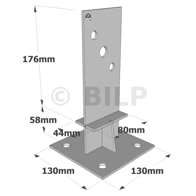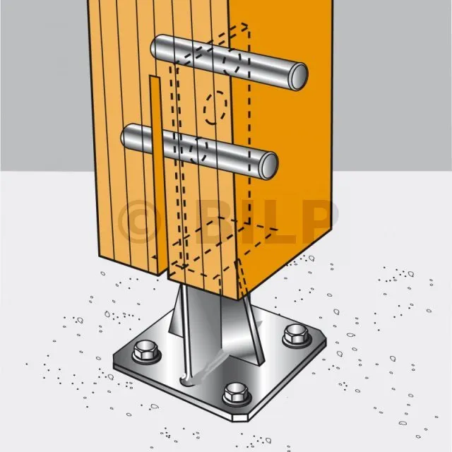 - Holzverbindung auf starrem TrägerAn Pfosten : 2 Edelstahlbolzen Ø12 oder Ø16 oder Edelstahlschrauben Ø12 mm oder 16 mm je nach Bohrung ; auf Beton : 4Ø12 (BOAX-II-Dübel M12-104/5 A4 ; Gewindestange M12) ; auf Stahl : Edelstahlschrauben Ø12