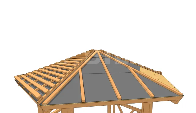 Die restlichen Latten werden parallel zur ersten Reihe befestigt (mit einem der Pfette entsprechenden Lattenabstand). Lege zwischen jede Latte eine Schablone, um Fehler zu vermeiden und die Arbeit zu beschleunigen. Achte darauf, dass du an allen Schnittpunkten der Latten mit den Sparren nagelst. Wiederholen Sie dies bis zur Spitze des Daches (am First). Dann schneiden Sie mit einer Säge die Enden der Dachlatten ab, die über den Rand hinausragen, d. h. an den seitlichen Dachrändern.