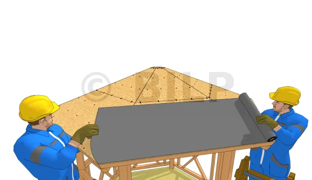 Beim Verlegen einer flexiblen Dachfolie ist es wichtig, sie vorübergehend mit einigen Klammern zu befestigen, sodass sie an beiden Enden straff gespannt ist. Die obere Bahn muss die zuvor verlegte untere Bahn überlappen. Deshalb wird die Folie zunächst von unten her ausgerollt.