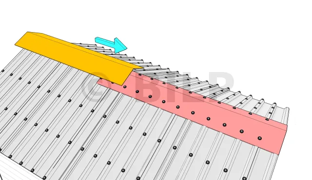 Ein Dachblech verdeckt die an die Attika angrenzenden Teile und hilft so, das Eindringen von Wasser in diese Ecken zu verhindern. - Überprüfen Sie dazu die geeigneten Maße des Dichtungsbleches : die Dicke der hölzernen Dachakrone, eine kleine Überhanghöhe nach außen von der Oberseite der Dachakrone (etwa 2 cm), die Höhe zwischen der Dachakrone und der Stahltraufe sowie eine ausreichende Breite auf der Stahltraufe.