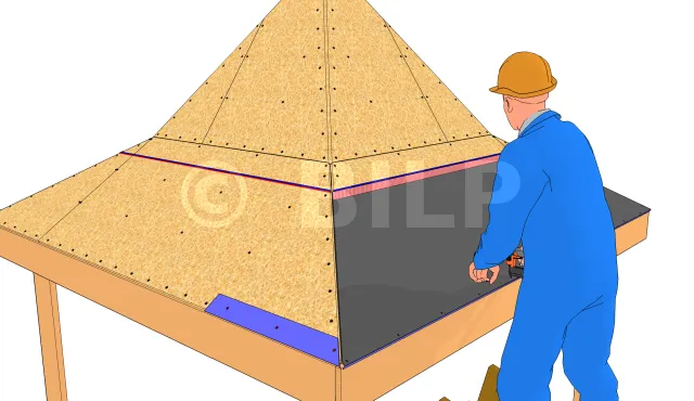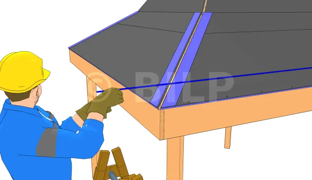 Wenn du eine Schicht Dämmpapier über die Platten legst, wird das Dach vor Feuchtigkeit geschützt. Um eine erste Reihe Isolierpapier links auszurichten, ziehen Sie eine Markierungslinie (mit einer Richtschnur) ab 78 cm von der Dachrinne aus und lassen Sie etwa 1 cm mehr stehen. Anschließend bringst du die Dämmstoffe so an, dass sie in jeder Reihe 5 cm übereinander liegen, wobei du darauf achtest, dass die Scheitelpunkte der Dämmstoffe mit den Markierungslinien übereinstimmen. Wenn zwei Bahnen an einer vertikalen Fuge zusammenstoßen, ist eine Überlappung von mindestens 10 cm erforderlich. Schlage schließlich im Abstand von 30 cm sorgfältig Klammern ein, um sie an den Randstreifen zu befestigen.