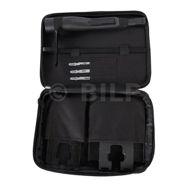 - Mit drei Hochleistungsstichsägeblättern für Kurvenschnitte in Holz, Schnitte mit hoher Geschwindigkeit in Holz und Kunststoff sowie Geradschnitte in Eisen- und Nichteisenmetallen