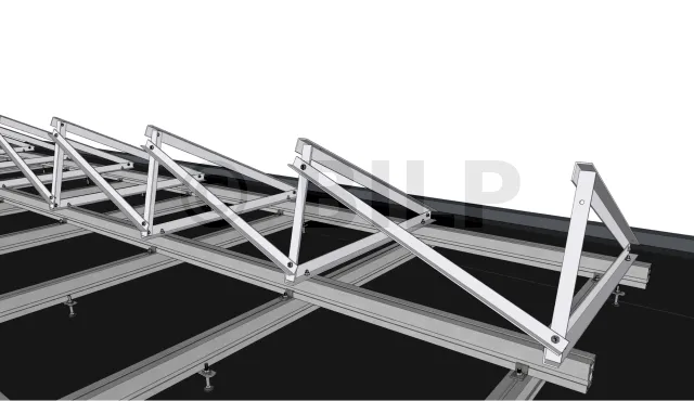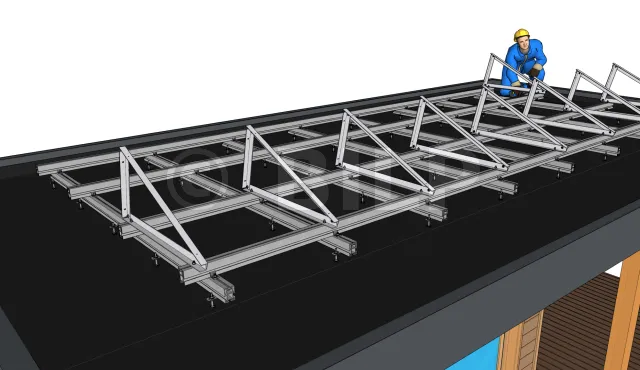 Die Abstandshalter werden mithilfe einer Schraube und einer Mutter an der Rückseite des Rahmens befestigt. Ein Ende des Distanzbands wird an die Oberkante eines Fahrgestells geschraubt, während das andere Ende an der Unterkante des benachbarten Fahrgestells befestigt wird.