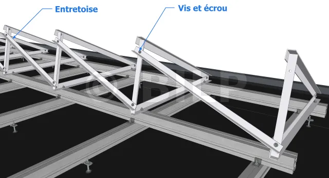 Die Abstandshalter werden mithilfe einer Schraube und einer Mutter an der Rückseite des Rahmens befestigt. Ein Ende des Distanzbands wird an die Oberkante eines Fahrgestells geschraubt, während das andere Ende an der Unterkante des benachbarten Fahrgestells befestigt wird.