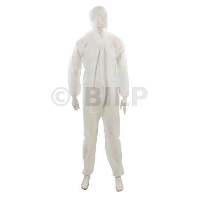 Weißer Einweg-Overall aus Polypropylen. Reißverschluss vorne sowie Kapuze, Arm- und Beinabschlüsse mit Gummizug. Leicht und atmungsaktiv. Für staubige Umgebung, wie z. B. bei Renovier- und Wartungsarbeiten ideal.
