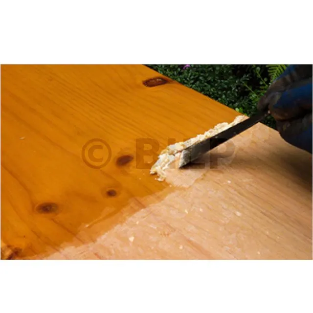 - Entfernen Sie die entstandene Paste mit einem Spachtel oder einer Nylonbürste (je nach Härte des Holzes). Auf empfindlichem Holz oder auf Innenflächen für ein sauberes Erscheinungsbild, bevorzugen Sie eine weiche Messingbürste. Spülen Sie das DSP 800 mit einem feuchten, in warmem Wasser getränkten Schwamm ab (achten Sie darauf, die Holzfaser nicht anzuheben, ggf. mit mittel- bis feinkörnigem Schleifpapier entfernen).