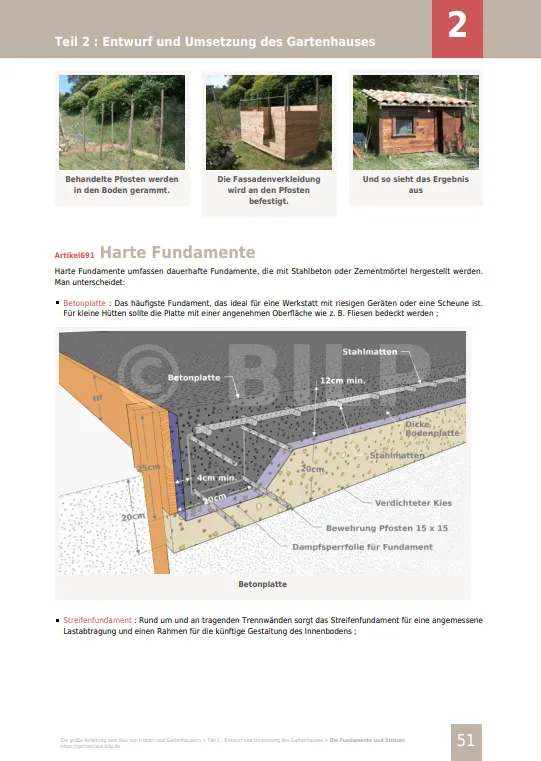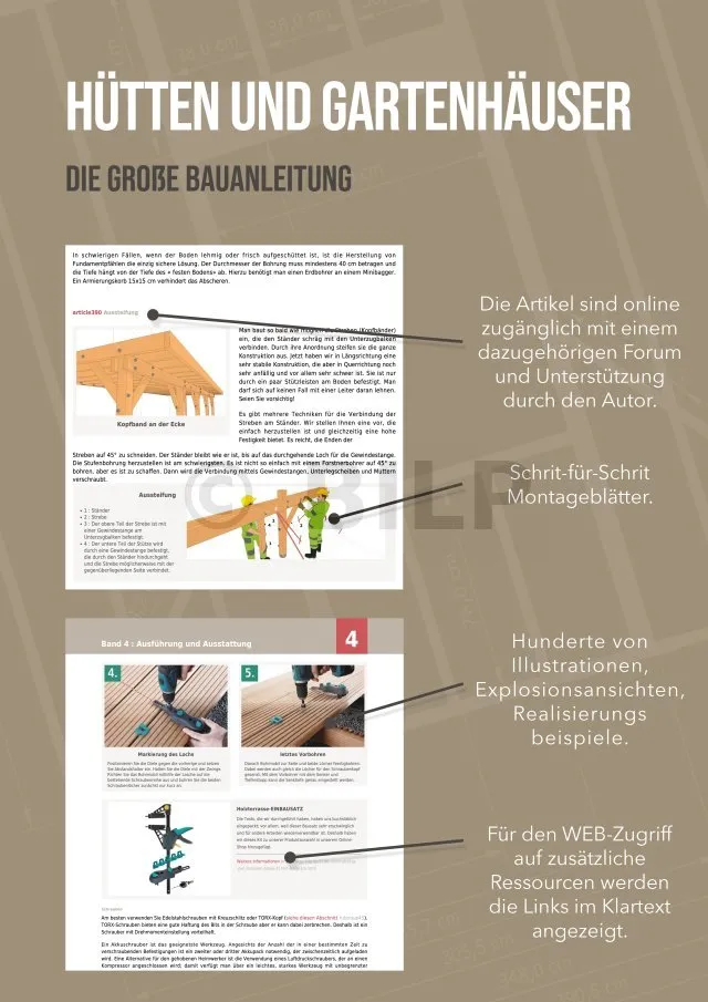 Konkrete Informationen für Ihr Projekt. Alle Geheimnisse, alle Tipps und Tricks, damit Ihre Hütte, Ihr Gartenhaus, Ihre Garage oder Ihr Anbau gelingt. Alle Techniken, alle Produkte werden Ihnen objektiv und unabhängig beschrieben. Detaillierte Ansichten beschreiben Ihnen alle Schritte des Baus.