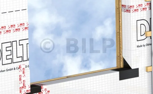 Flexible Ecke zur Abdichtung der Öffnungsrahmen von Holzrahmenkonstruktionen. Mit gerillter Oberfläche für leichtes Schneiden. UV-beständiges Material.