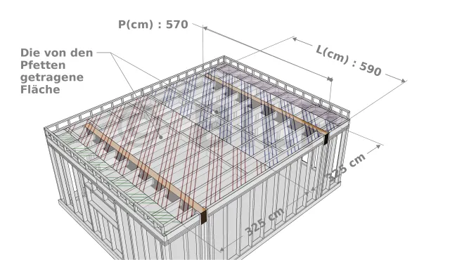 Aufgrund der großen Spannweite und des großen Achsabstands der Pfetten mussten wir Brettschichtholz verwenden, das je nach Holzart eine Dichte von bis zu 700 Kg/m3 hat.