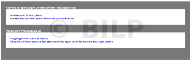 Nachdem Sie alle Merkmale eingetragen haben, führt das Tool die Berechnungen durch und teilt Ihnen mit, ob die Struktur, die Sie implementieren möchten, tragfähig ist oder nicht. Wenn die Merkmale nicht überprüft werden, sind Sie dann gezwungen, einige Änderungen vorzunehmen, z. B. am Querschnitt des Bauteils, an der Spannweite des Bauteils oder an der Festigkeitsklasse,usw.