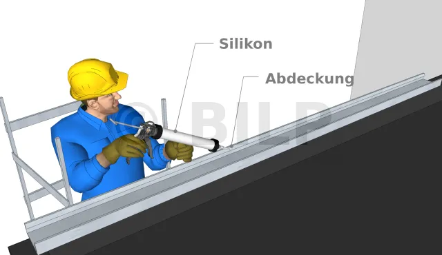 Nachdem Sie Silikon auf die Lasche aufgetragen haben, schieben Sie sie auf die bereits angebrachte Dacheindeckung.