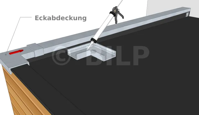 Beginnen Sie mit dem Einfüllen von Silikon in die Innenseite der Randabdeckung. Dann geben Sie Silikon unter die zuvor angebrachte Sonnenfinsternis. Drücken Sie schließlich die Eckabdeckung fest auf den Kleber, während Sie sie unter die Lasche schieben.