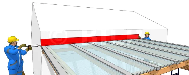 Bringen Sie an der Verbindung zwischen Polycarbonatplatte und Gebäudewand einen Bleidichtungsring, Aluminiumring oder ähnliches an und schließen Sie mit einem Punkt Silikon in den Hohlräumen ab.