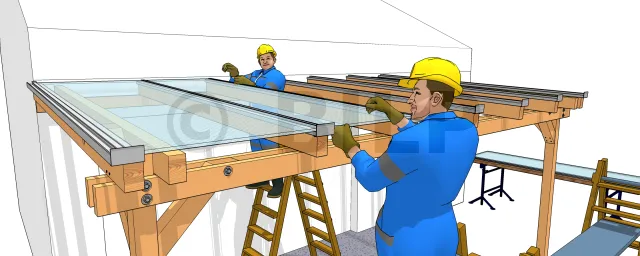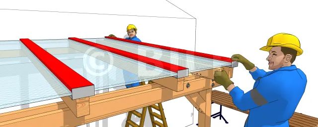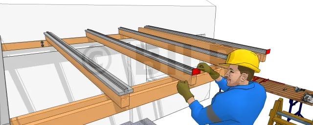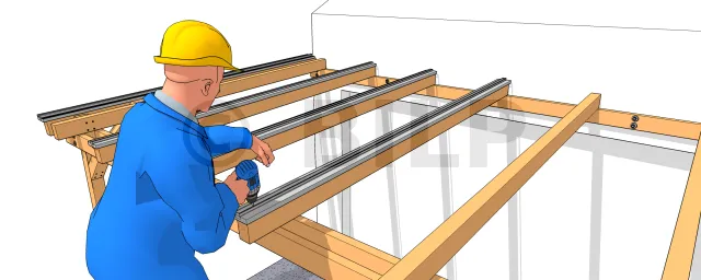 Positionieren und verschrauben Sie die Rand- und Verbindungsprofile auf den Sparren. Lassen Sie jedes Profil etwa 2 cm über den Querbalken hinausragen.