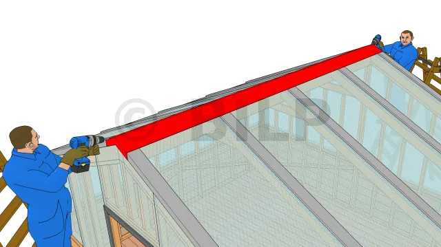 Verlegen Sie den First und schließen Sie mit einem Punkt Silikon entlang der gesamten Unterseite des Firstes ab, um die Wasserdichtigkeit zu gewährleisten.