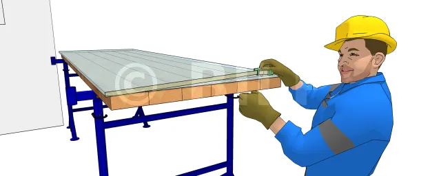 Nachdem du die Schutzfolie von der Unterseite entfernt hast, positioniere die Platten (Seite mit der Aufschrift : UV-behandelt - der Sonne zugewandt), wobei du zwischen den Platten und dem Rand des Profils 5 mm Spielraum für die Dehnung lassen solltest.